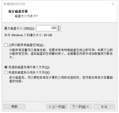 在这里我们将磁盘大小设置为160GB,选择“将虚拟磁盘存储为单个文件”然后点击“下一步”。