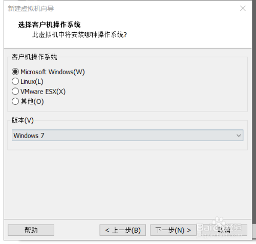 在该窗口中选择该虚拟机准备安装哪一个操作系统,点击“下一步”。这些选项主要是影响虚拟硬件的配置。VMware Workstation会根据选择的操作系统自动设置适合该操作系统的虚拟硬件。我们在这选择“Windows 7”后,点击“下一步”