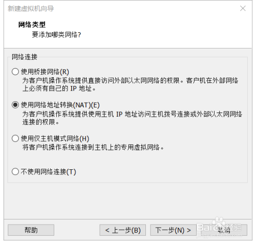 该窗口的几种网络方式我们后面会为大家详细介绍。在这里可以选择默认“使用网络地址转换(NAT)”,点击“下一步”。
