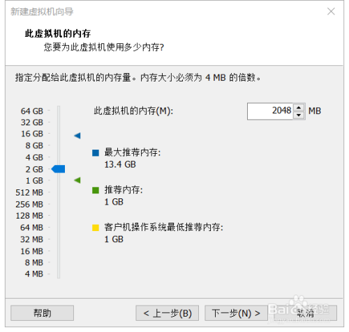 用于配置给该虚拟机的内容量,最大内存不超过物理内存。但要注意的是,一但虚拟机启动,会立刻从物理内存中划拨设定的内存量给虚拟机,留给物理机程序使用的内存会相应减少,若设置过大,会导致物理机内存不足。一般使用默认的即可。若物理机内存足够大,可根据自身需要进行设置。这里我们给2GB。点击“下一步”。