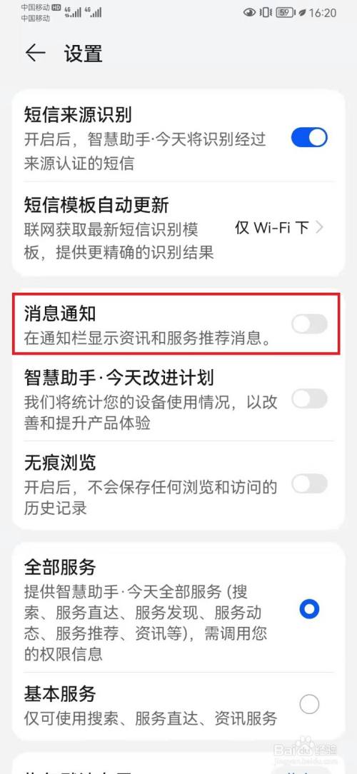 在华为手机上,通过智慧助手的今天设置关闭消息通知推送开关的方法。