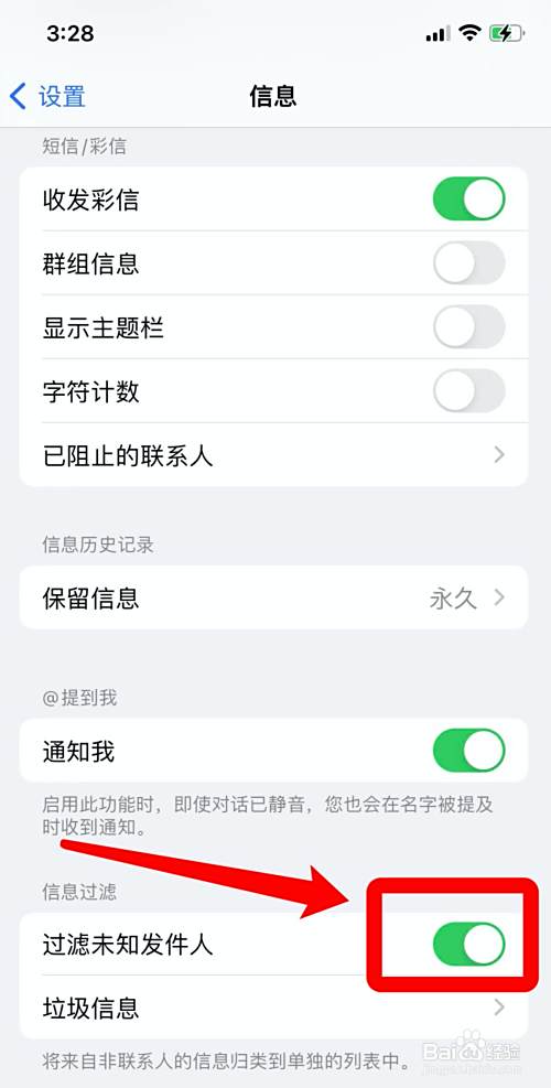 在信息设置页,将“过滤未知发件人”功能点亮。