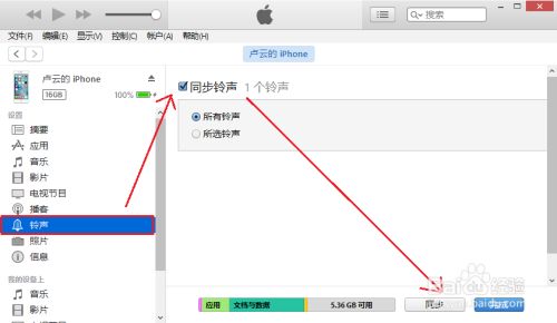 点击左边的“铃声按钮”,将中间的“同步铃声”复选框选上,并点击右下角的“同步”按钮。