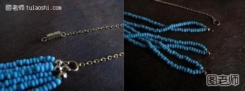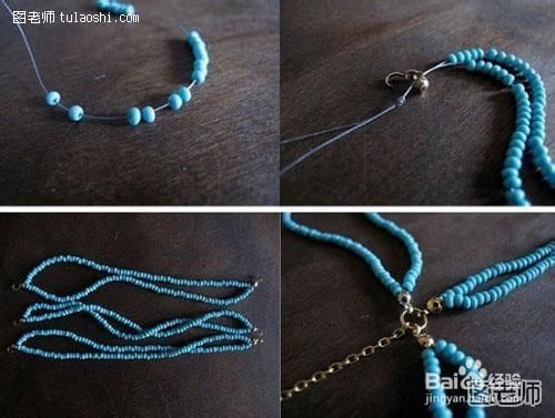 将蓝色小珠子用粗线串成链子,首尾都要套入项链扣、打结。重复制作三条,并用小金属环将项链扣、链条组合在一起。