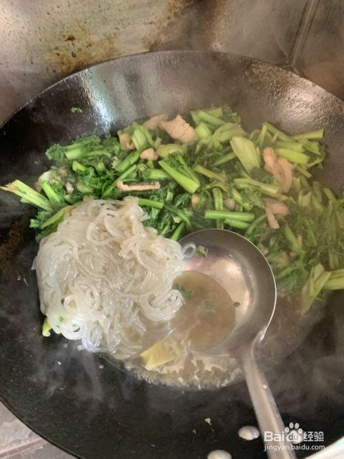 放入提前泡软的粉条汤汁大概没过一半的菜中小火炖一会炖到粉条和苔菜软烂