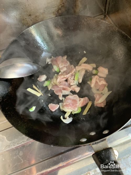 铁锅烧热无水状态下加入油适量放入蒜瓣翻炒出香味放入腌好的肉翻炒变白