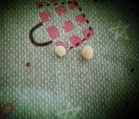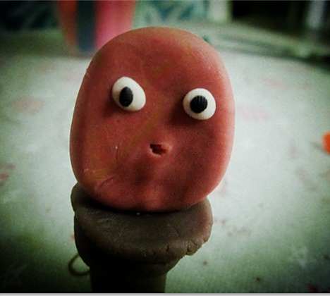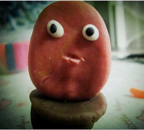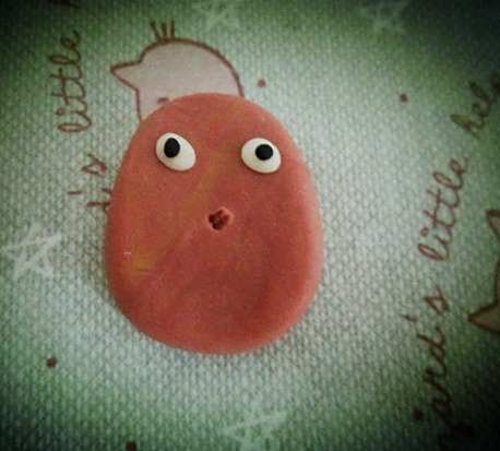 4把白色眼球和黑色眼珠粘到棕红色橡皮泥上,作为脸谱,并用竹签在棕色橡皮泥上挑个嘴巴,如图。