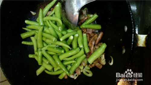 接着放入杭椒段,大火翻炒一下,至杭椒变成翠绿