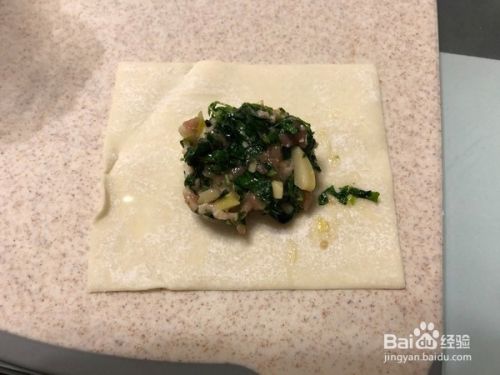 皮的四边粘点清水后对折起来,再把下面的2个角粘住即可