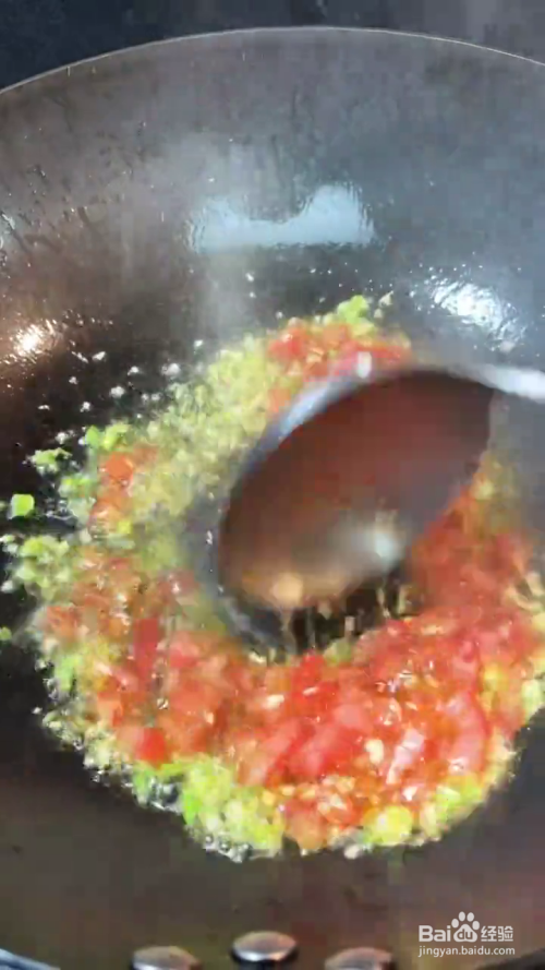 放在一旁备用,切点西红柿丁,小油菜丁,起锅烧油,葱蒜下入西红柿,把这酸味炒出去,加少许的蚝油,水,加入适量的盐味精鸡精,调好口味