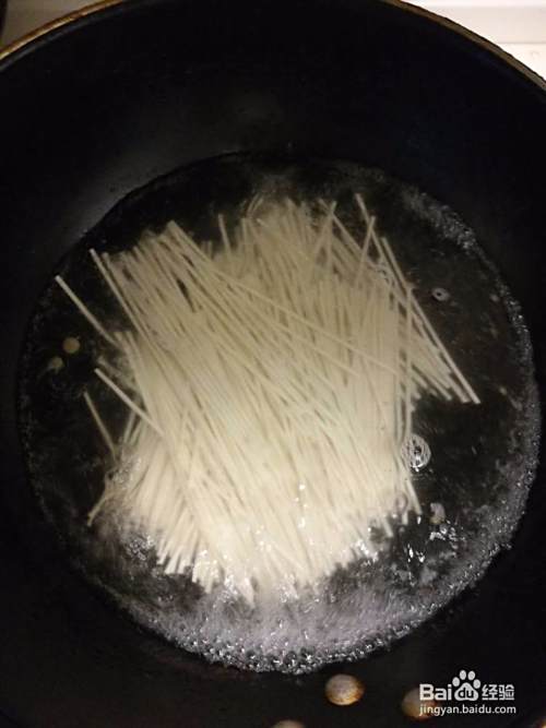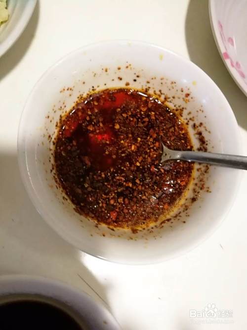先制作辣油。辣椒面放在小碗中,油锅里烧热,趁热把油倒入小碗。