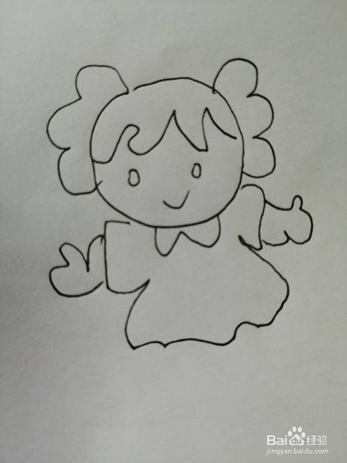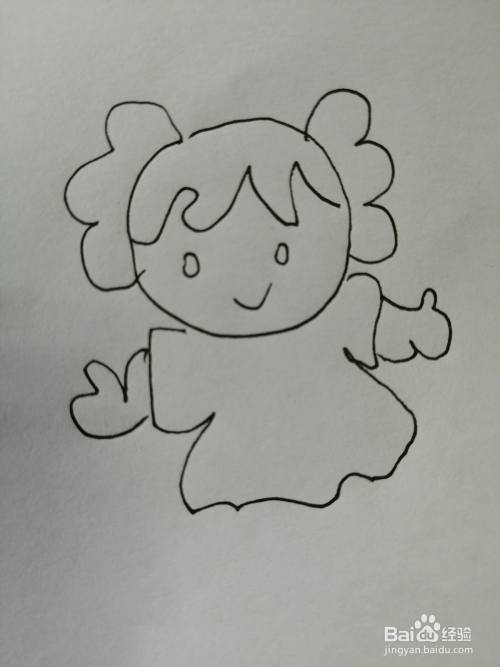 第五步,接着继续画出乖巧的小女孩的漂亮的小裙子,注意小女孩两只手臂的画法。