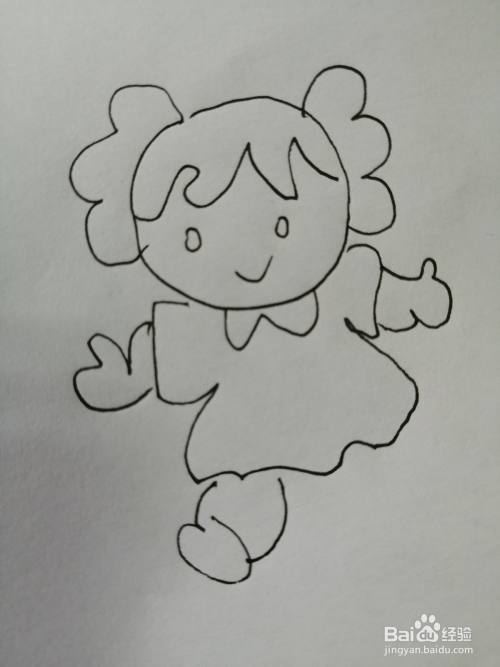 第七步,最后在乖巧的小女孩的裙子下面画出乖巧的小女孩的两条腿。乖巧的小女孩就画好了。