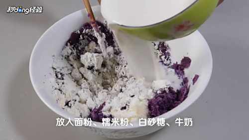 2成品制作:将紫薯放入锅中蒸熟,碾成泥,放入面粉、糯米粉、白砂糖、牛奶,揉成均匀的面团。