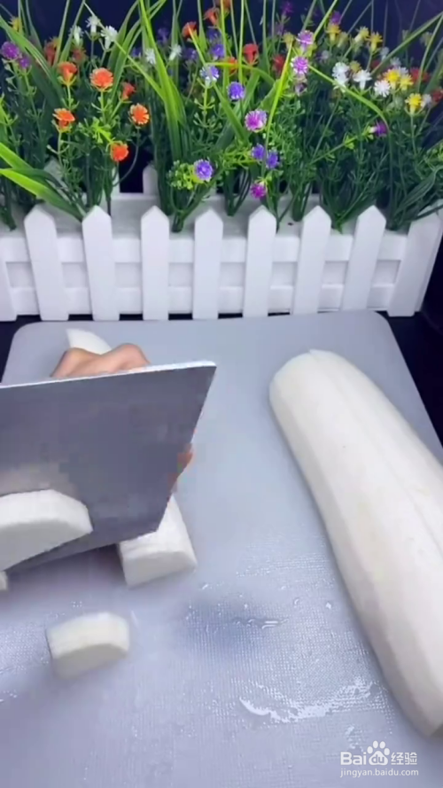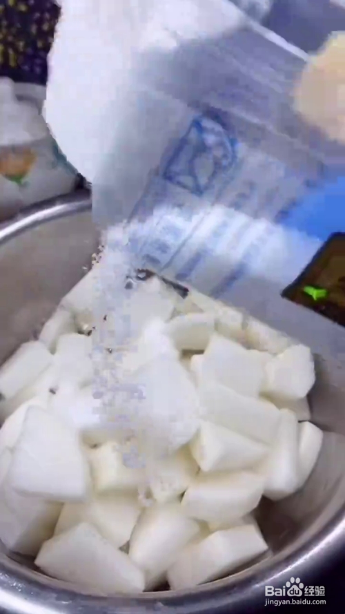 我们将白萝卜清洗干净,然后竖切一分为四,切成夹刀块,放入盆中,加入食盐腌制出水分,这样也能去掉萝卜的涩味