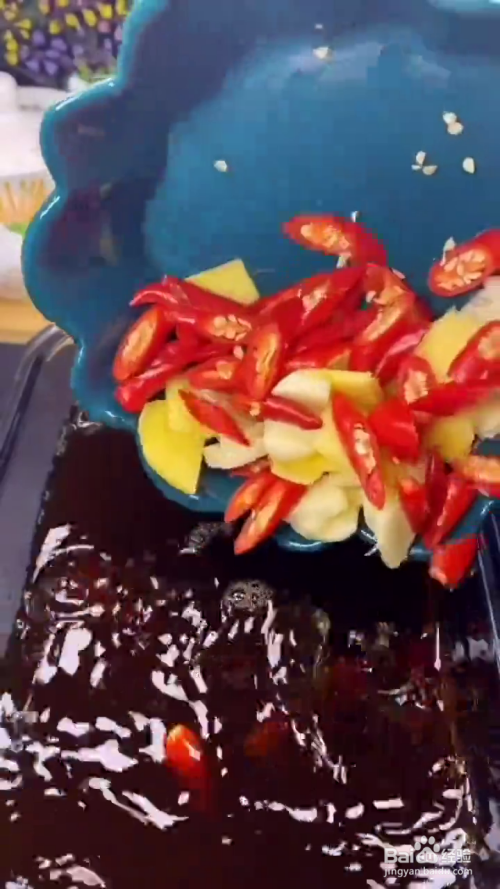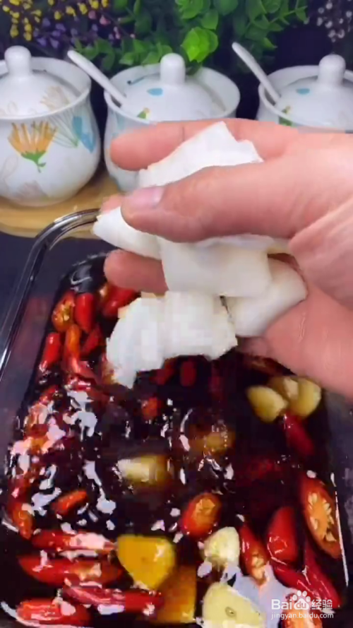 然后放入切好的姜蒜,小米辣,再将腌好的萝卜块去掉腌出的水,清洗干净后攥干水分,放入汁水中,然后放入冰箱冷藏四小时以上,就能享用啦
