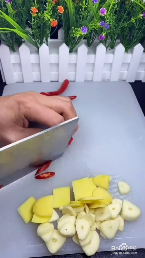然后我们将小米辣斜切,生姜和大蒜切片,准备一个能密封的容器,在里面放入生抽,米醋,白糖,再加入适量的凉白开,不确定分量的话,可以搅拌后试试味道