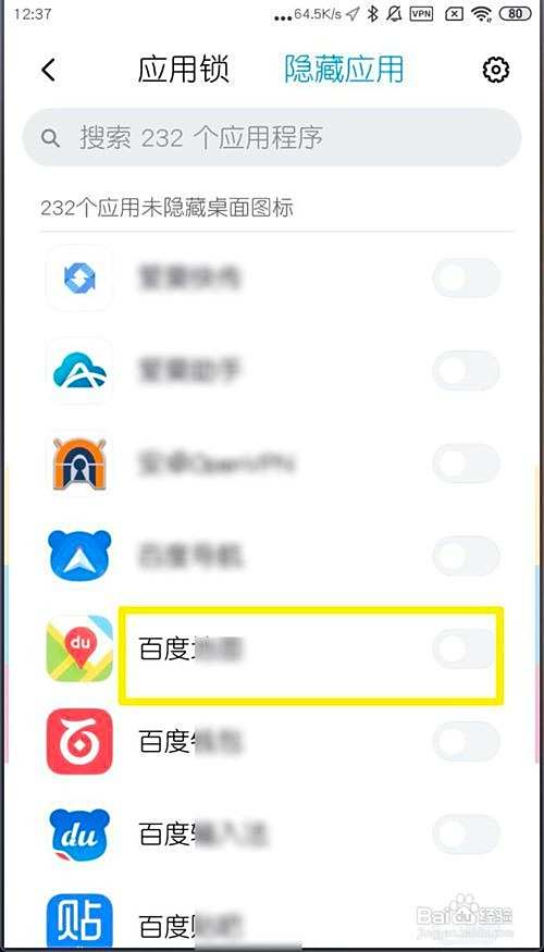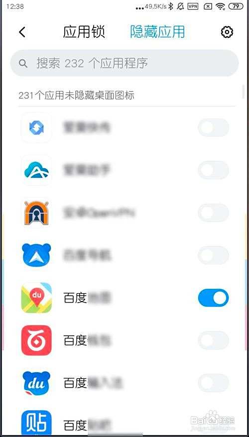 6、那么应用开关打开,那么此应用的图标,就隐藏了起来。
