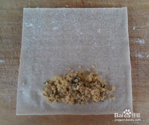 将春卷皮摊平,在皮子靠底部的位置放上一汤匙的馅料,然后将皮子往上方卷2圈,再将两边的皮子向内折起来,继续往上方卷成春卷;