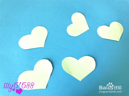 用淡绿色的纸剪出五个大小一样的爱心,如图所示;