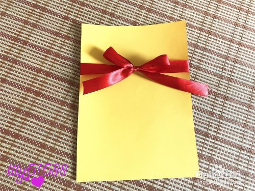 拿出橙色的纸,在上面用红色的丝带扎上1个蝴蝶结,如图所示;