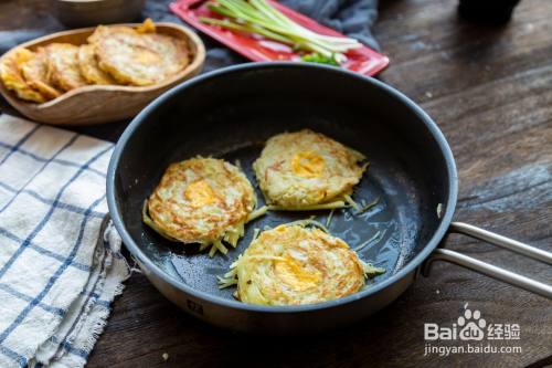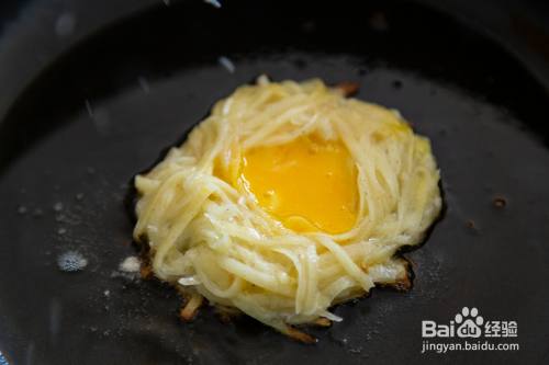 锅中倒入油,取一人份的土豆丝放入锅内,用筷子凹出圆形,中间留空,小火煎2分钟左右