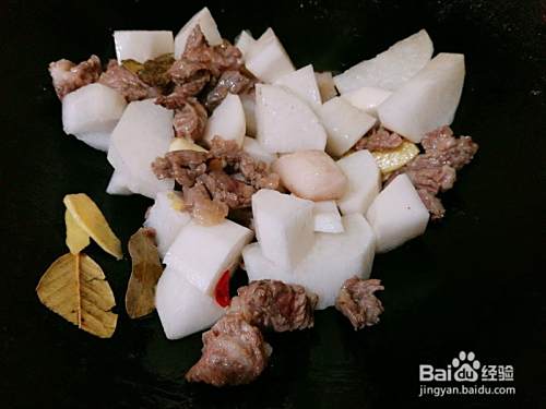 3.接着把萝卜去皮切成块倒下去一起翻炒均匀。