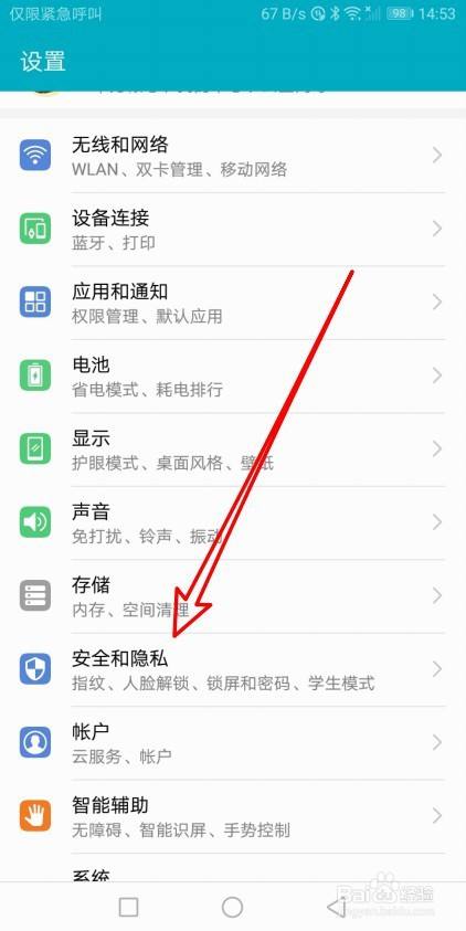 然后再打开设置页面,点击安全和隐私的菜单。