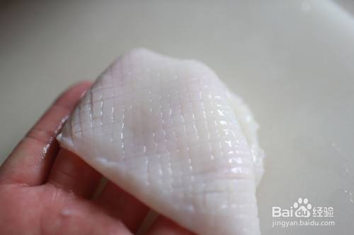 把清理好的鱿鱼翻过来,里面朝上,把刀倾斜15度切鱿鱼,间隔要一致,下刀不能太用力,每一刀都留在4分之3处,不能切断。一面切完以后从另一侧用同样方法切,直至完成。把片好的鱿鱼间隔2厘米左右切成段备用