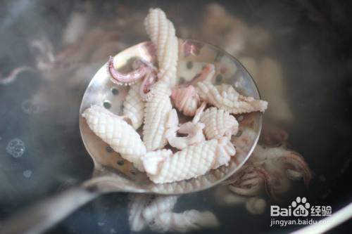 锅中烧开水,放入一勺料酒,水烧开后下入鱿鱼,打卷后立刻捞出放入冷水中