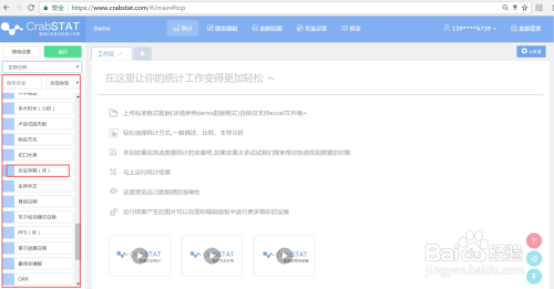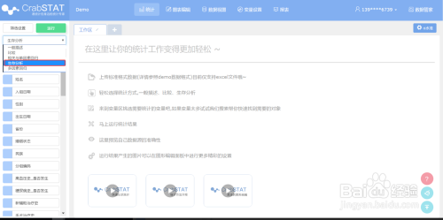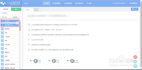 在“数据管家”可以上传本地的excel数据。本例选择软件自带的“Demo”数据,在“Demo”数据那一行,点击“统计按钮”。