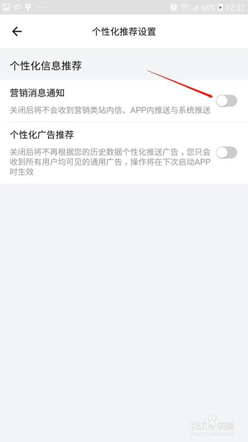 在个性化推荐设置页面,将“营销消息通知”后的开关关闭即可。