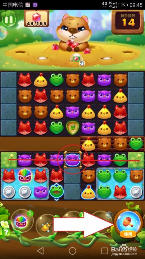 在14步时,道具大木棰集满可以使用。但不要着急,我们使用紫色发光猫头鹰可以消除草丛,让游戏继续向下,之后使用大木棰,威力才不会浪费。