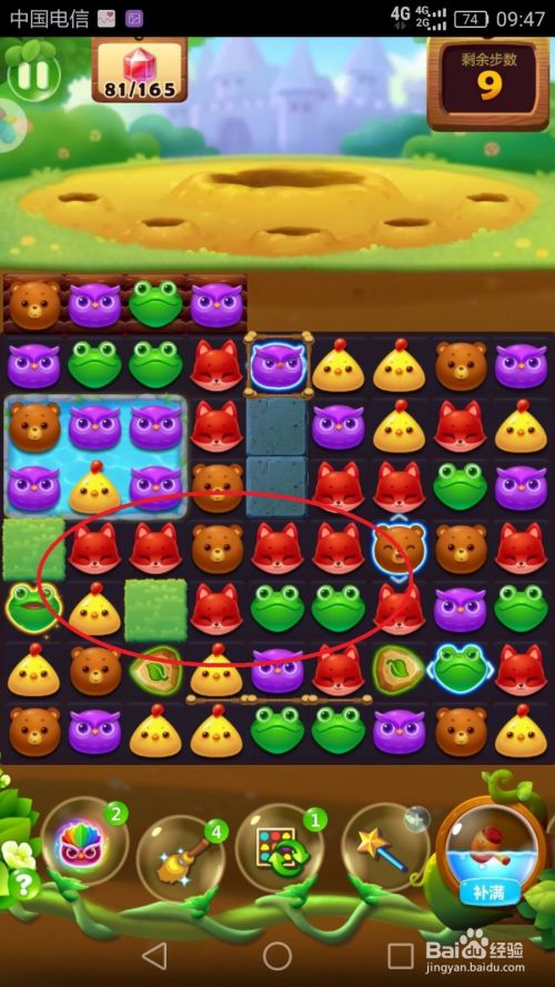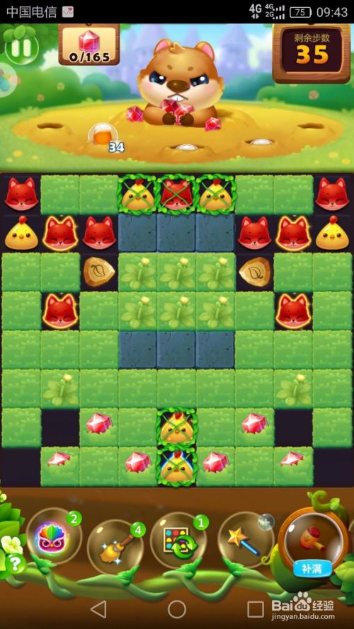 在4步时,我们只有85个宝石,离目标还有一半,但不要怕,打败地鼠会有42颗宝石的奖励,我们只要消除36组动物,就可以打败一次地鼠。我们可以利用特殊的小鸡和猫头鹰一次性消除三排草丛