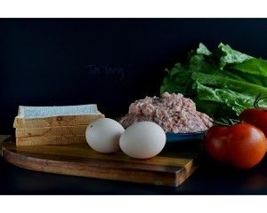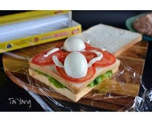 西红柿上挤上一些沙拉,水煮蛋对半切开铺在上方。如果三明治是切三角形的,水煮蛋就对角摆放。