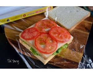 拿保鲜膜垫底下,铺上一片吐司,洗干净的生菜选叶撕小片铺上后加入一块厚厚肉饼,