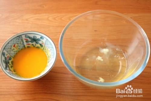 1、3个鸡蛋,蛋清蛋黄分离,装蛋清的盆要干净无油无水,蛋黄搅散备用;