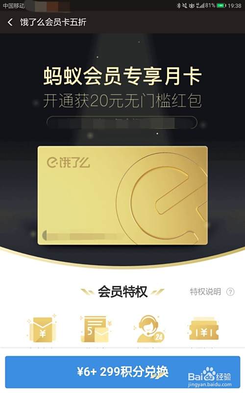 最后,在“饿了么会员卡五折”页面,点击下方蓝色框中的“6+299积分兑换”。