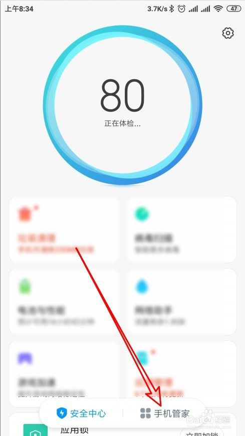 在手机上打开手机管家,然后点击底部的“手机管家”的选项卡。