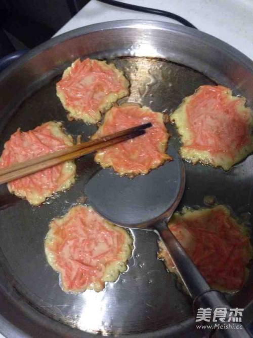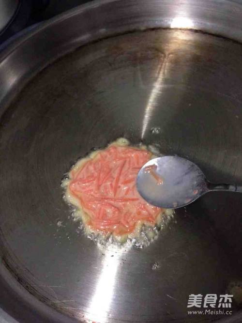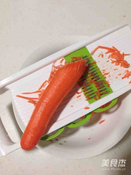 4添加面粉,面粉的量根据拌好的胡萝卜丝的多少添加,以每根丝都沾上就好