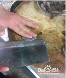 在从基围虾后背上片开,用刀轻轻拍两下。片好的虾放好。