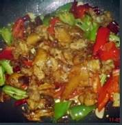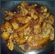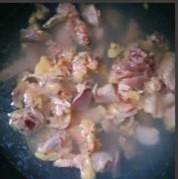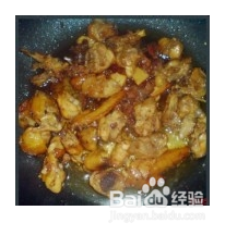 在锅里多倒一些油,放入腌制好的鸡快,加入一大勺豆瓣酱,将鸡肉炒至焦黄后盛起