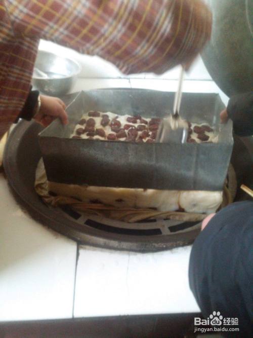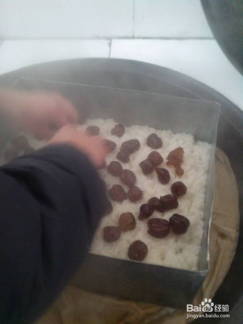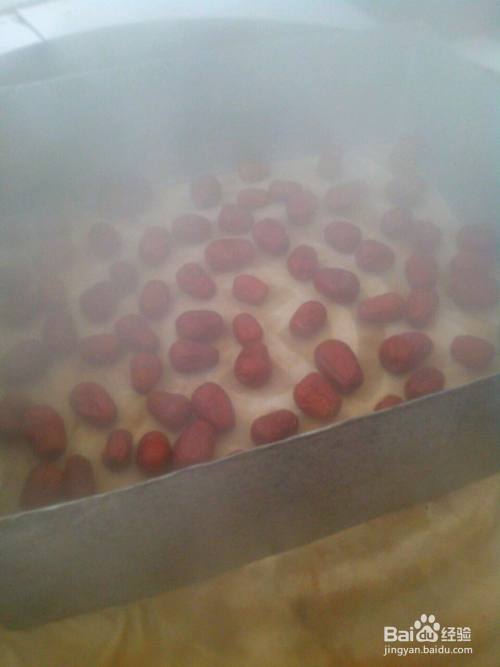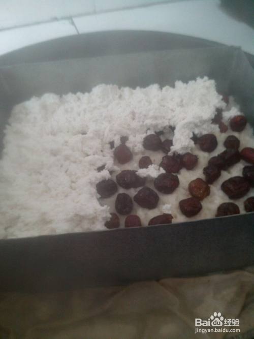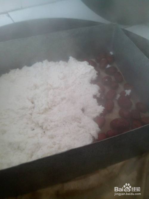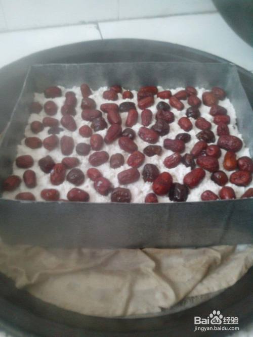 剩下的枣子都铺在顶层,这样两层的糯米面年糕就铺好了。上锅蒸30分钟。