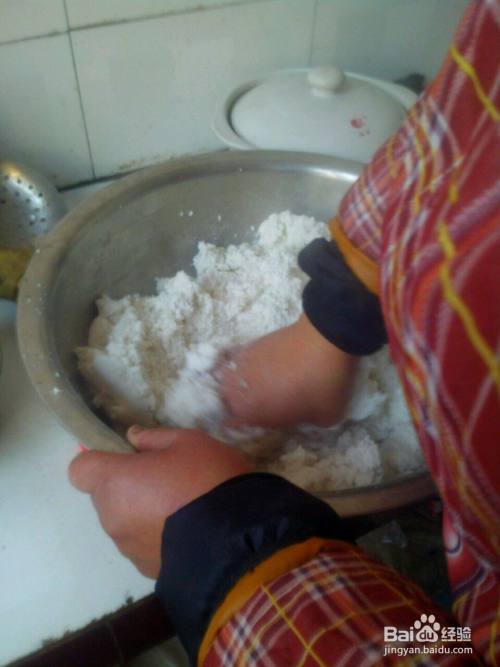 一半的糯米面,用温水和开,类似于和面粉,和勻直至没有面疙瘩就好了。