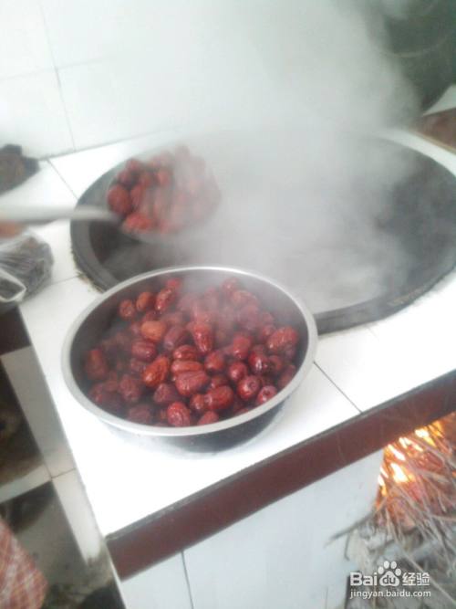 大锅烧开一锅水,把大枣烫一下,时间不能超过一分钟,不能把枣煮坏了。