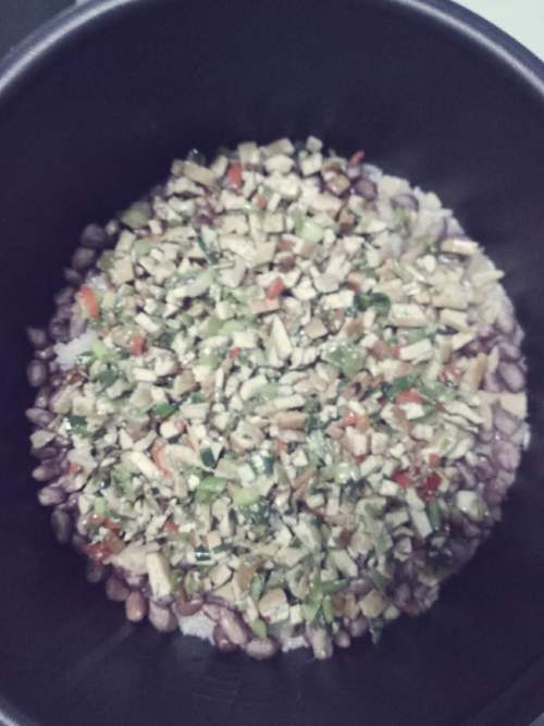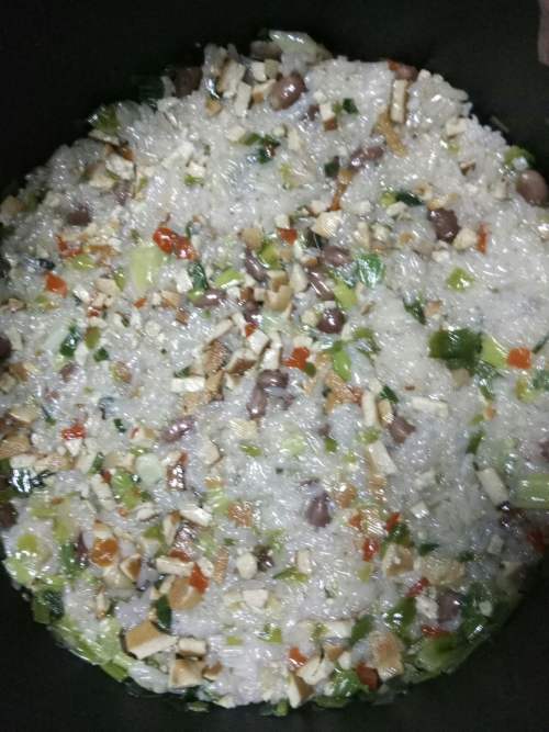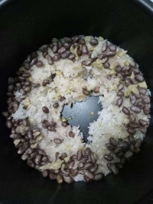 11.花生提前浸泡20分钟,糯米和花生一起蒸熟,或者放电饭锅煮。 2.我用的电压力锅做的:糯米、花生、生姜末、盐,放锅里,加水,开始煮饭。