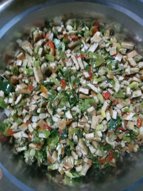 21.豆干、青椒、红尖椒、蒜苗,全部切丁,炒熟,不要炒过了,备用。 2.把炒菜的锅用刷子洗干净,水擦干备用。