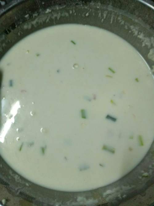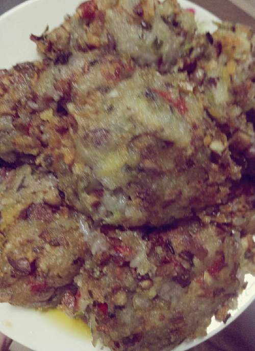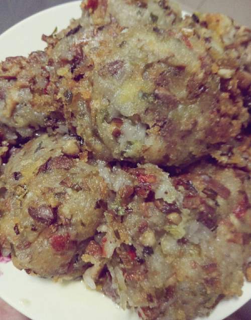 61.面粉放一点点水,用筷子搅拌均匀!注意,一定不能多放水,这样保证饭团能够粘上面粉不掉,且厚! 2.锅里放适量油和饭团一样高就可以,还是比较费油的噢