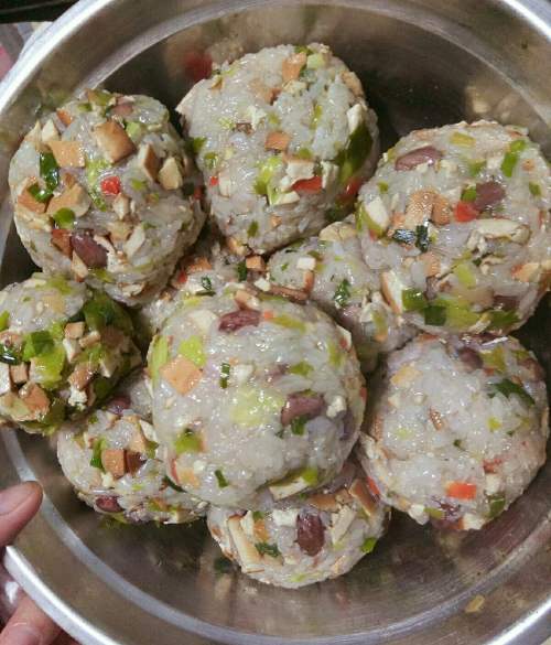 5用手袋把饭揉捏成团,捏紧,菜不能掉,炸的时候不会散!