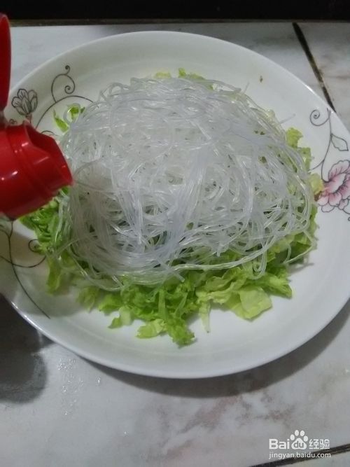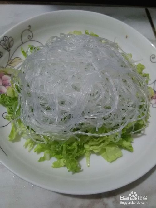 将煮熟的粉丝放在盛白菜的盘子里面。